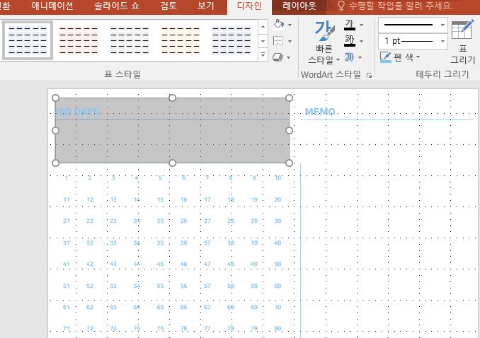 속지에 어떻게 서식을 넣을지 미리 생각해두시고, 복사한 표를 이용해서 서식을 만들어주세요. 서식을 만들때 나중에 도형 삽입을 하더라도 초안은 표 서식을 통해서 틀을 잡으시는 게 좋습니다. PPT 특성상 비율을 대부분 맞춰주지만 어긋날 때도 있어서인데요. 때문에, 표를 통해서 미리 서식 라인을 잡아두시는 걸 권장드립니다.