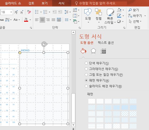 스터디 플래너 색상과 디자인은 가이드 전편의 스터디플래너 서식을 고려해서 되도록 일관되게 만들었습니다. 메모란은 도형 삽입을 통해서 도형을 넣어주고, 패턴 채우기를 통해서 그리드 형식으로 맞춰줬는데요. 점자 형식이나 스트라이프 형식을 활용하셔도 예쁜 서식으로 만드실 수 있습니다.