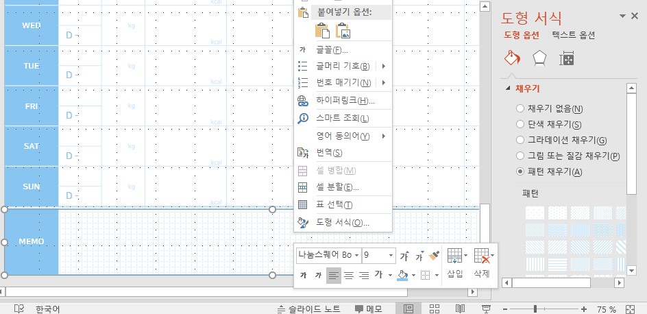 일주일간의 다이어트 기록을 모두 쓰고나서 최종 피드백과 기타 메모를 할 수 있는 칸을 맨 아래에 구성해봤습니다. 똑같은 셀을 한 줄 복사해서 아래에 붙여 넣기 식으로 만들어 줄 건데요. 셀 색상을 똑같이 흰색으로 하면 너무 밋밋해서 패턴을 넣어줬습니다. 패턴 넣기는 해당 셀이 선택된 상태에서 마우스 오른쪽 우클릭을 통해 도형 서식을 들어가주세요. 그러면 오른쪽에 도형 서식 메뉴의 패턴 채우기가 있습니다. 패턴 채우기는 취향에 따라 하셔도 좋지만, 굿노트 속지나 노트용이라면 그리드 형태로 하시는 걸 추천드립니다.