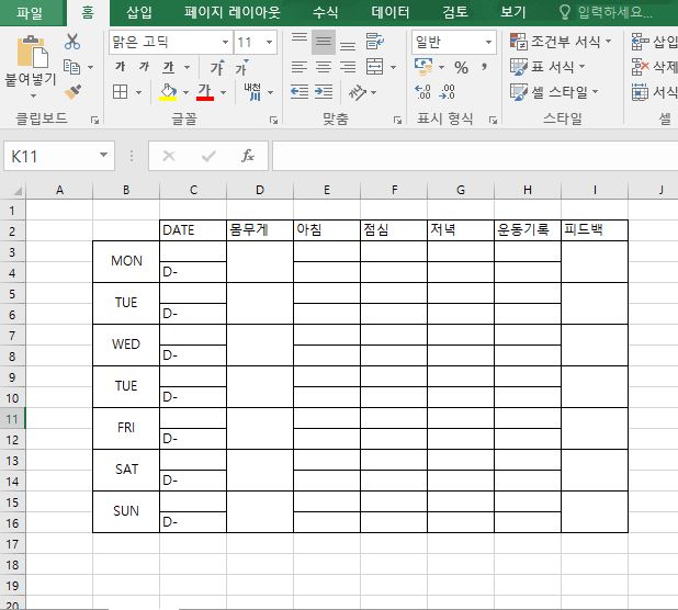 먼저, 다이어트 일지를 구성하는 서식을 만들어 보도록 하겠습니다.