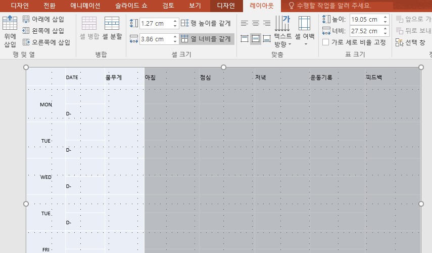 엑셀에서 만들어진 다이어트 식단 서식을 이제 PPT로 가져와서 구체적으로 디자인 해보도록 하겠습니다. 엑셀을 거치지 않고 PPT에서부터 표 만들기를 통해서 만들고 싶지만, PPT에서는 표 여백의 문제 때문에 이렇게 서식을 만드는 것이 힘들어서 이렇게 만드는데요.