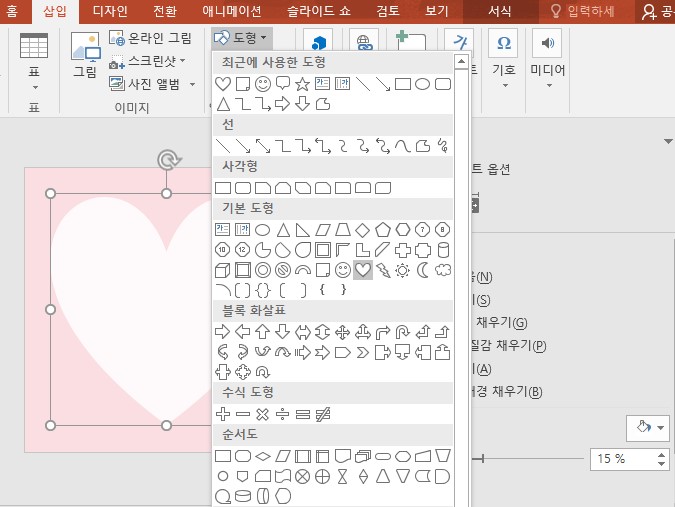 아이패드 다이어리로 플래너나 버킷리스트, 일기 등을 쓰는데요. 그때 내 최애 항목에 대한 표시를 할 수 있는 스티커도 만들어 봤습니다. 도형 삽입에서 하트 모양을 선택해주시면 사진과 같이 연출할 수 있습니다.