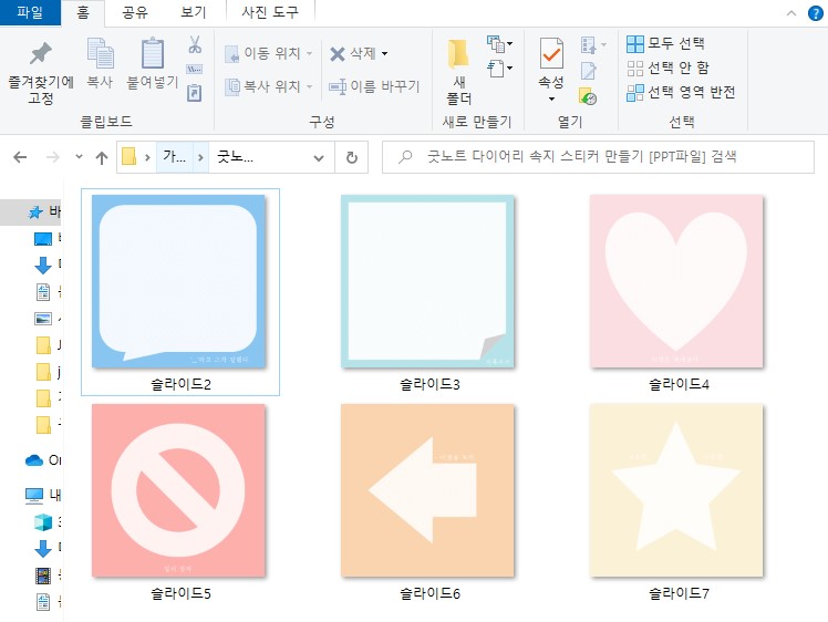 제가 이 스티커를 만들면서 사용한 프로그램은 MS사의 PPT인데요. PPT 저장시, 사진처럼 파일 형식을 PNG나 JPEG와 같은 이미지 형태로 변형이 가능합니다. PPT에서는 키노트처럼 투명 배경으로 만드는 부분에서는 미흡한 부분이 있는데요. 때문에, 원형과 기타 이미지 스티커는 어렵고, 지금 만든 것처럼 사각형 프레임으로 만들어지는 스티커는 만들 수 있습니다. 이번 가이드 편에서는 순수하게 PPT 기능만으로 어떤 굿노트 스티커를 만들 수 있는지에 초점을 맞춰 만들었는데요. 다음 활용 편에서 이 스티커를 어떻게 또 만들 수 있는지 보여드리도록 하겠습니다.