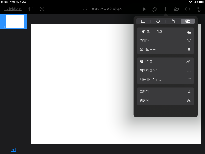 이제 키노트를 여시고, 방금 전 기기 갤러리에 저장했던 굿노트 속지 이미지를 불러와주겠습니다. 먼저, 키노트 메뉴에서 '+'아이콘을 눌러주세요. 가장 오른쪽에 이미지 아이콘을 눌러주시면, '사진 또는 비디오'라는 버튼이 있습니다. 여기를 통해서 좀전에 저장했던 이미지를 불러올 수 있습니다.