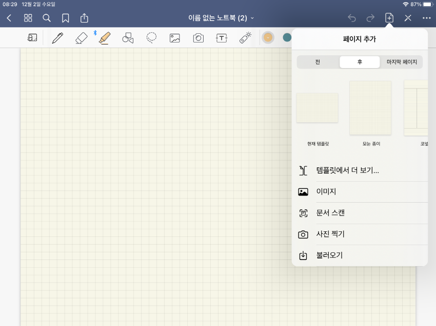 먼저, 굿노트 속지 중 아무거나 선택하셔도 상관없습니다. 굿노트를 처음 하신다면, 굿노트에서 새문서를 추가해서 우선 굿노트 속지를 열어주세요. 그리고 사진과 같이 메뉴 중 '+'표시가 되어있는 문서 아이콘을 눌러주세요. 그러면 페이지 추가 창이 나오게 됩니다. 여기서 '템플릿에서 더 보기'를 선택해주시면 여러분의 입맛에 맞게 용지의 종류와 크기 방향을 정할 수 있습니다.