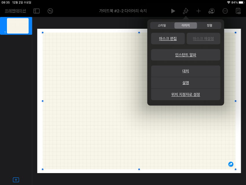 키노트 슬라이드로 불러온 굿노트 속지 이미지는 바로 사용하기엔 비율이 맞지 않는데요. 키노트의 자르기 기능으로 사용하기 좋게 만들어주겠습니다. 이미지가 선택된 상태에서 키노트 메뉴 중 '붓 모양'을 눌러주세요. 그리고 '이미지' 카테고리를 선택하신 다음, '마스크 편집'을 누르시면 이미지를 내가 원하는 대로 자를 수 있습니다.