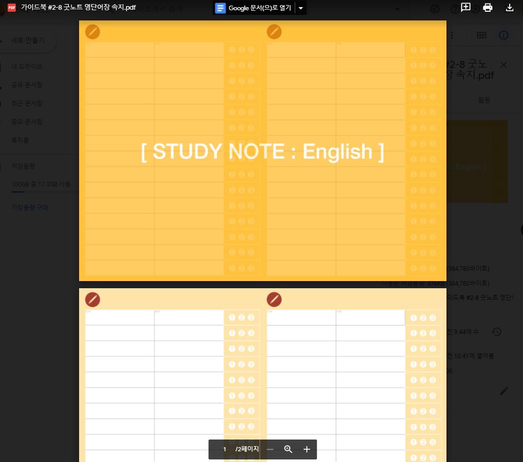 이렇게 굿노트 영단어장을 키노트에서 만들어봤는데요. 다 만든 영단어장은 아래 PDF 파일 형식으로 공유문서 링크를 걸어뒀습니다. 해당 링크 박스를 통해 쉽게 다운로드가 가능한데요.