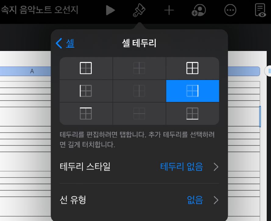 셀이 선택된 상태에서 사진처럼 '붓 모양'>'셀'>'셀 테두리'를 통해 해당 메뉴창을 열어주세요.